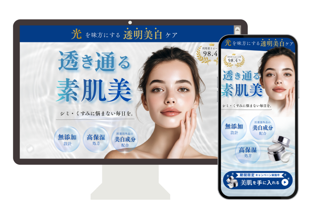 【意識したポイント】「透き通る素肌美」というコピーと、モデルのアップで理想の肌を提示し、LP冒頭でベネフィットを最大化する。清潔感、透明感、信頼感を重視し、製品の効果と安全性を印象付ける。