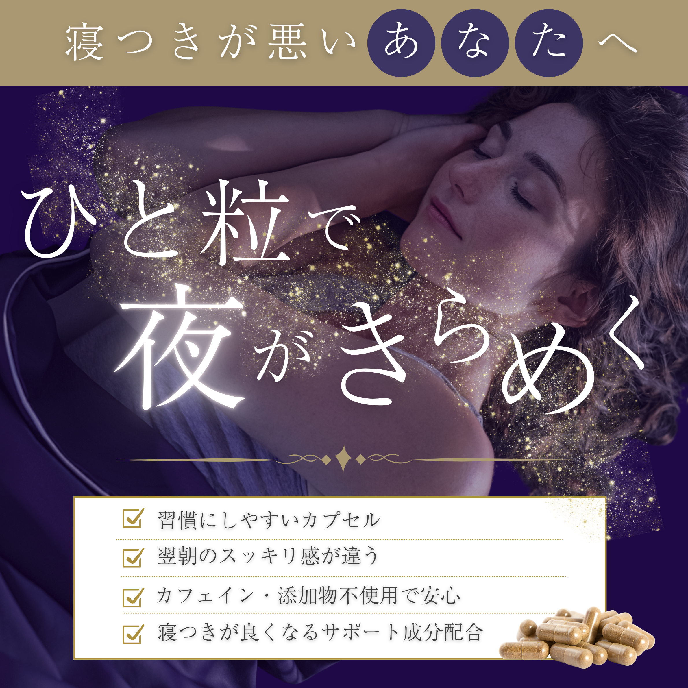 【意識したポイント】モデルが目を閉じている写真と幻想的な光の表現により、製品を使うことで得られる深いリラックスや上品な眠りという体験価値を表現する。「ひと粒で」という表現で、サプリメントの導入のしやすさ、手軽な習慣化を表現。