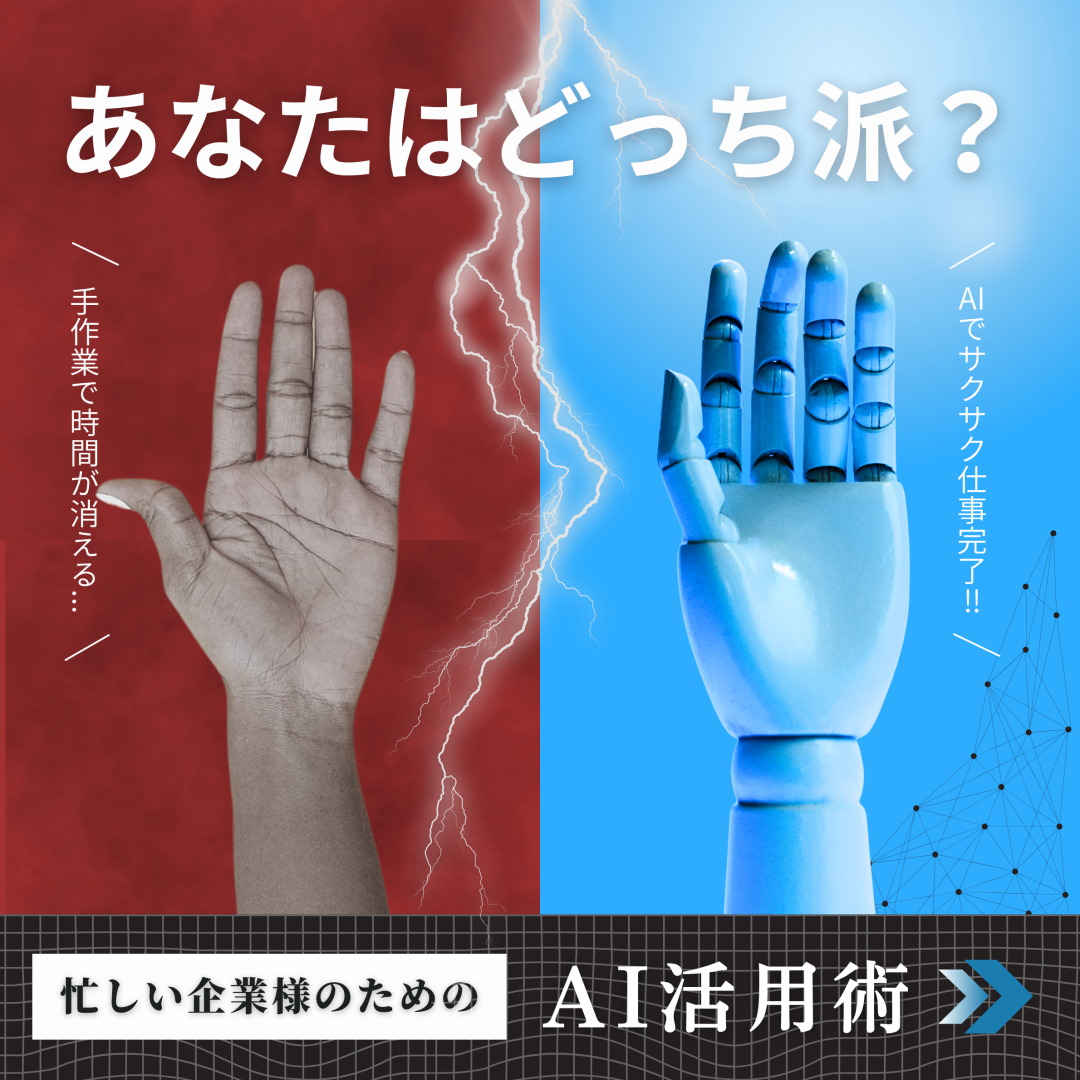 【意識したポイント】人間の手とメカニカルな手(AI)を対比させ、技術革新と未来の可能性を視覚的に伝える。「AI活用術」など、ユーザーのビジネス課題を解決するための具体的なソリューション提供を期待。